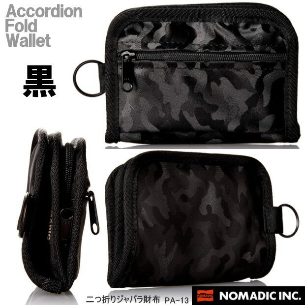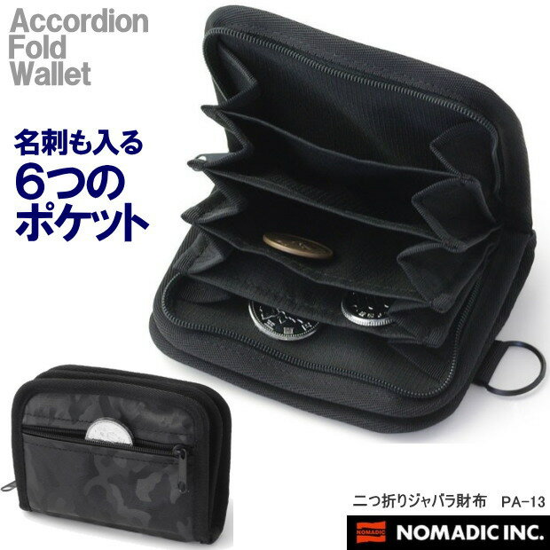 商品名 NOMADIC ノーマディック 二つ折りジャバラ財布 品番 PA13 黒 紺 サイズ 約:幅9cm×縦12cm×マチ2cm 重さ:約)82g 仕様 ・カード入れは表に6つ、そして札入れの内部にも2箇所のシークレットカードポケット付。